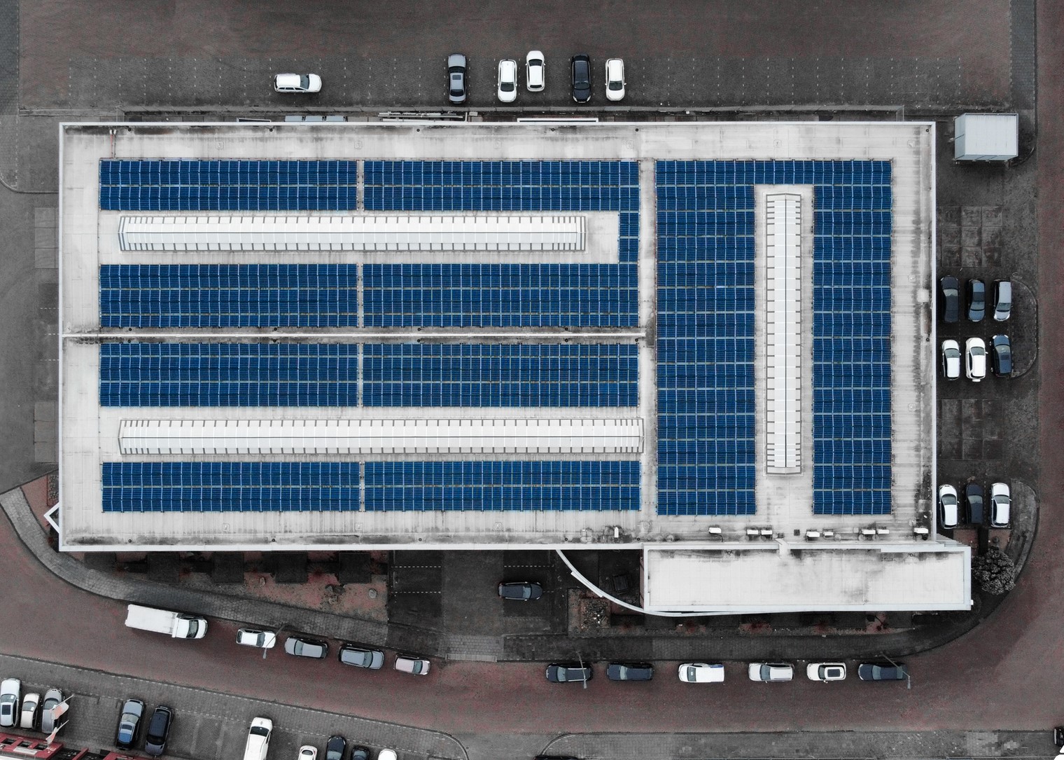 Een wit dak werkt extra efficiënt i.c.m. met zonnepanelen. - Het dak van de productieruimtes is in 2020 voorzien van een PV-installatie. Er liggen maar liefst 748 zonnepanelen op ons dak!
